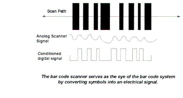 The function of the bar code scanner is to "read" the image presented by the bar code. In its most basic form, the scanner sees and measures the absence or presence of light in the code's bars and spaces, and converts that information into an electrical signal that can be translated into recognizable or computer-compatible data.